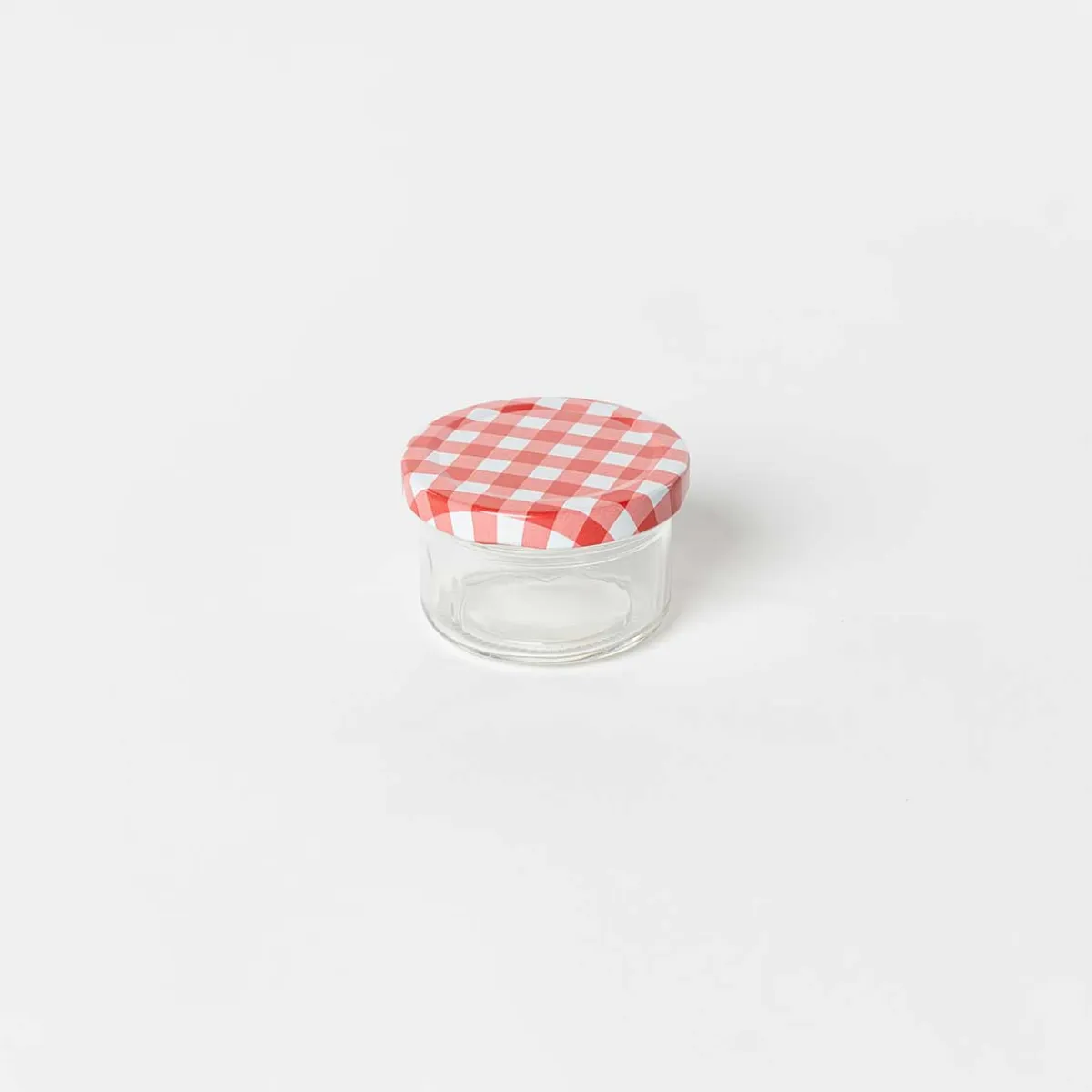 Frasco de vidrio c/tapa decorada 100cc | 7.2x8x8cm | ¿Sabías que tu cocina puede ser el lugar más feliz del mundo? Echa un vistazo a nuestra gama de utensilios para una cocina llena de Happy Home Living. ¡Cocinar con los utensilios adecuados es mucho más fácil! | Color: Transparente, Blanco, Rojo | Medidas: 7.2x8x8cm | Material: Vidrio | Capacidad: 350cc