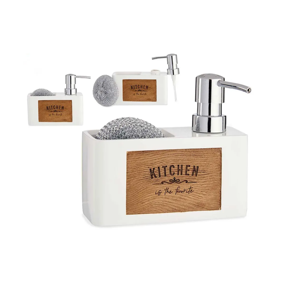 Dosificador Detergente Con Porta Estropajo | 15x6x14cm | La funcionalidad en la cocina es esencial y comienza con las soluciones de almacenamiento para la cocina. Desde el carrito multiusos, al botellero o los cubos de basura y reciclaje, encuéntralo todo en homa.es | Color: Blanco | Medidas: 15x6x14cm | Material: Plástico, Madera