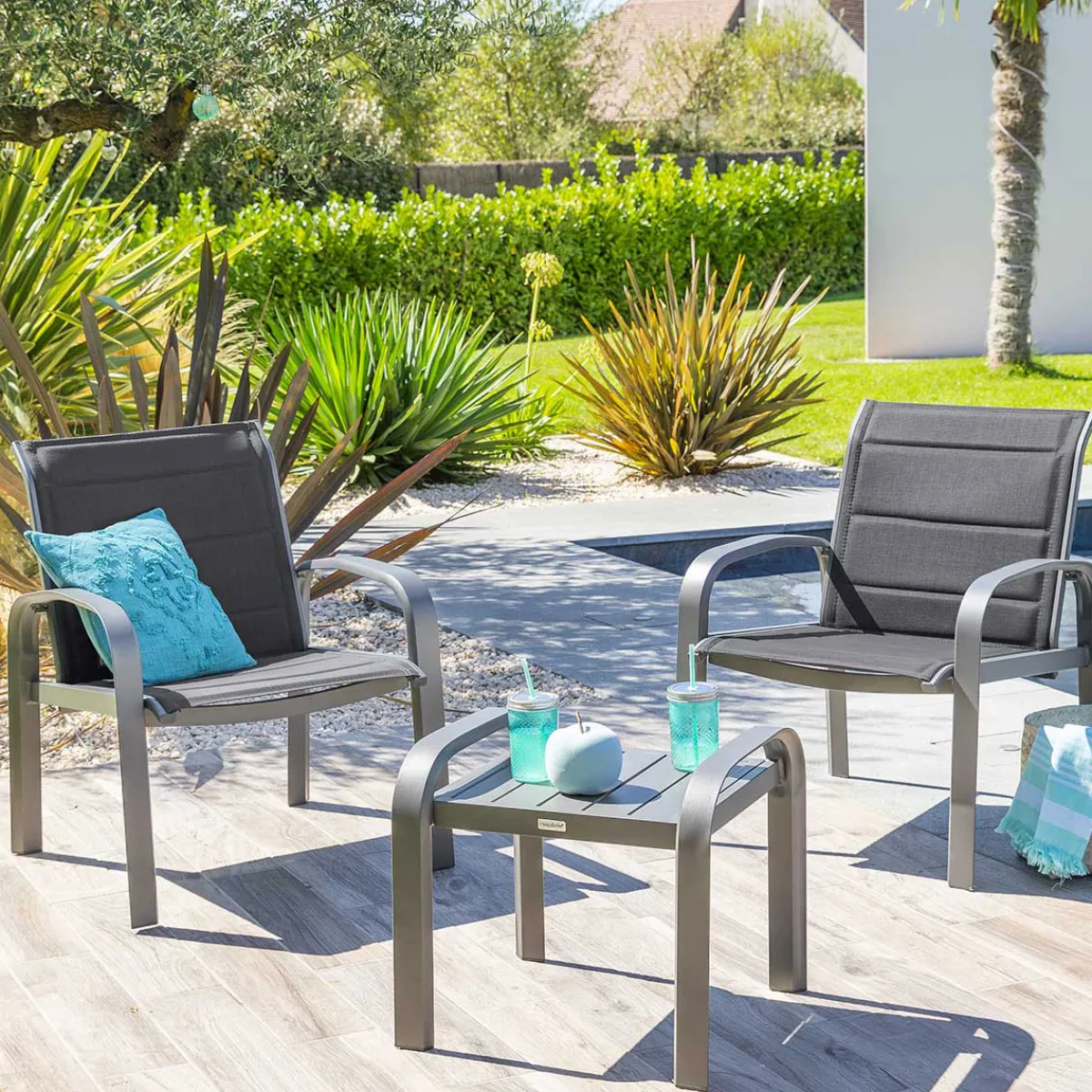Juego de jardín ELYN 2 plazas | Compuesto por 2 sillones y 1 mesa | Medidas del sillón: 66x68x84cm | Medidas de la mesa: 52x49x46.5cm | Material: Aluminio y Textilene | Color: Gris | Marca: Hespéride