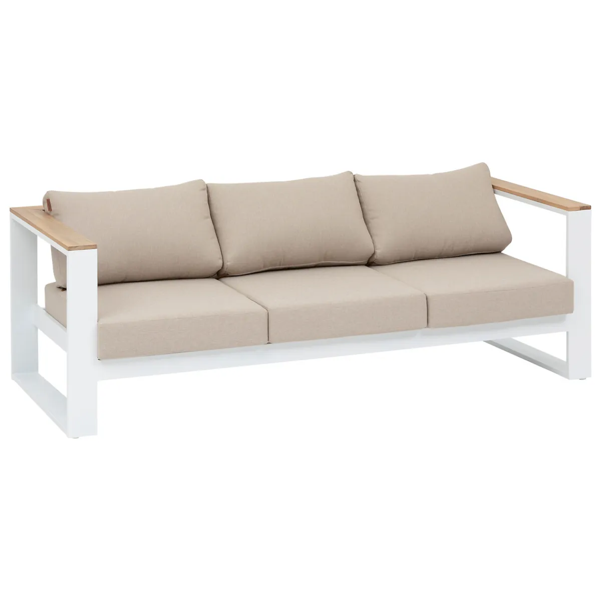 Juego de jardín EMPERIA blanco de madera acacia | Blanco | 5 Plazas | 2 Sillones: 68x84x94cm; Sofá 3 Plazas: 68x84x202cm; Mesa: 36.5x69x130cm | Estructura con tratamiento epoxi antioxidante | Madera FSC, protegida por barniz | Cojines desmontables | Tejido con tratamiento hidrófugo que permite el deslizamiento del agua sin penetrar en el material | Producto tratado contra la decoloración | Color: Beige, Blanco | Material: Aluminio, Madera de Acacia | Marca: Hespéride