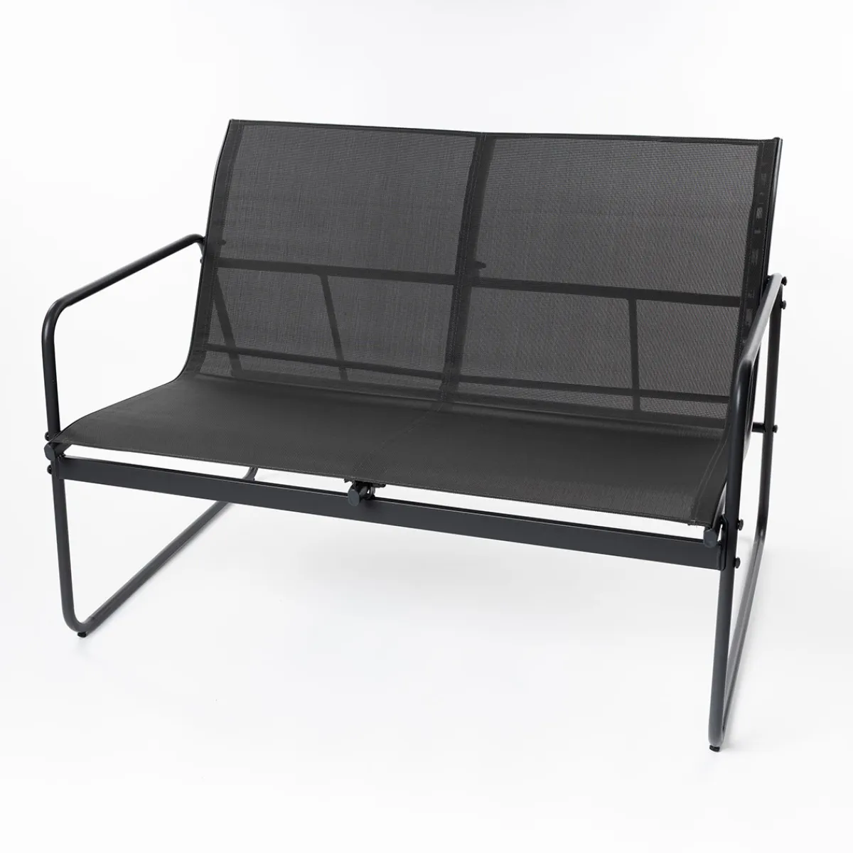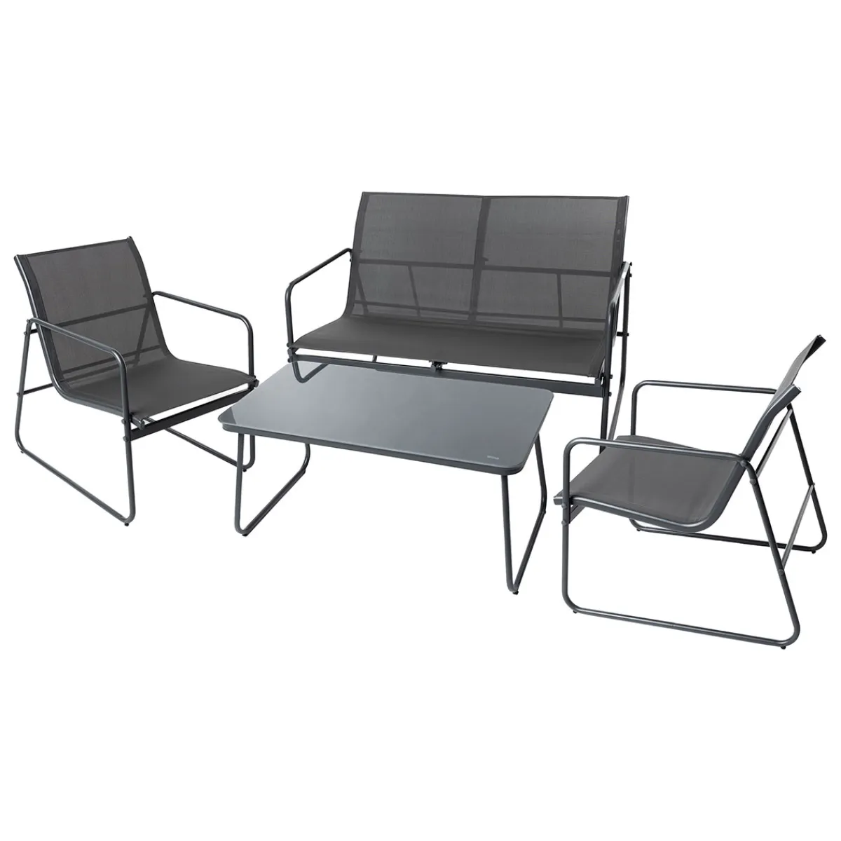 Juego de jardín en textileno gris | 4 plazas | Compuesto por 1 sófa de 2 lugares 103.5×71.5x74cm , 2 sillones 55.5×71.5x74cm, 1 mesa auxiliar 81×41.5×38.5cm | Color: gris | Material: Acero y textileno | Marca: Hesperide