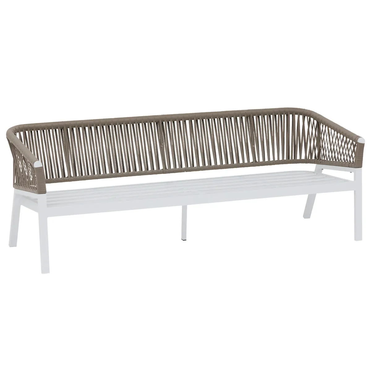 Juego de jardín ORIENGO gris pardo y blanco | Compuesto por un sofá de tres plazas, dos sillones y una mesa de centro con tapa de madera barnizada certificada Fsc | Los respaldos de cuerda añaden un toque de originalidad al conjunto. La estructura de aluminio con tratamiento epoxi es resistente a la oxidación. Se puede quitar la funda de los cojines para facilitar su limpieza | Durante el invierno, guarda tus muebles de jardín y protégelos con una funda | Color: Gris Pardo, Blanco | Material: Aluminio, Madera de acacia, Poliéster | Marca: Hespéride