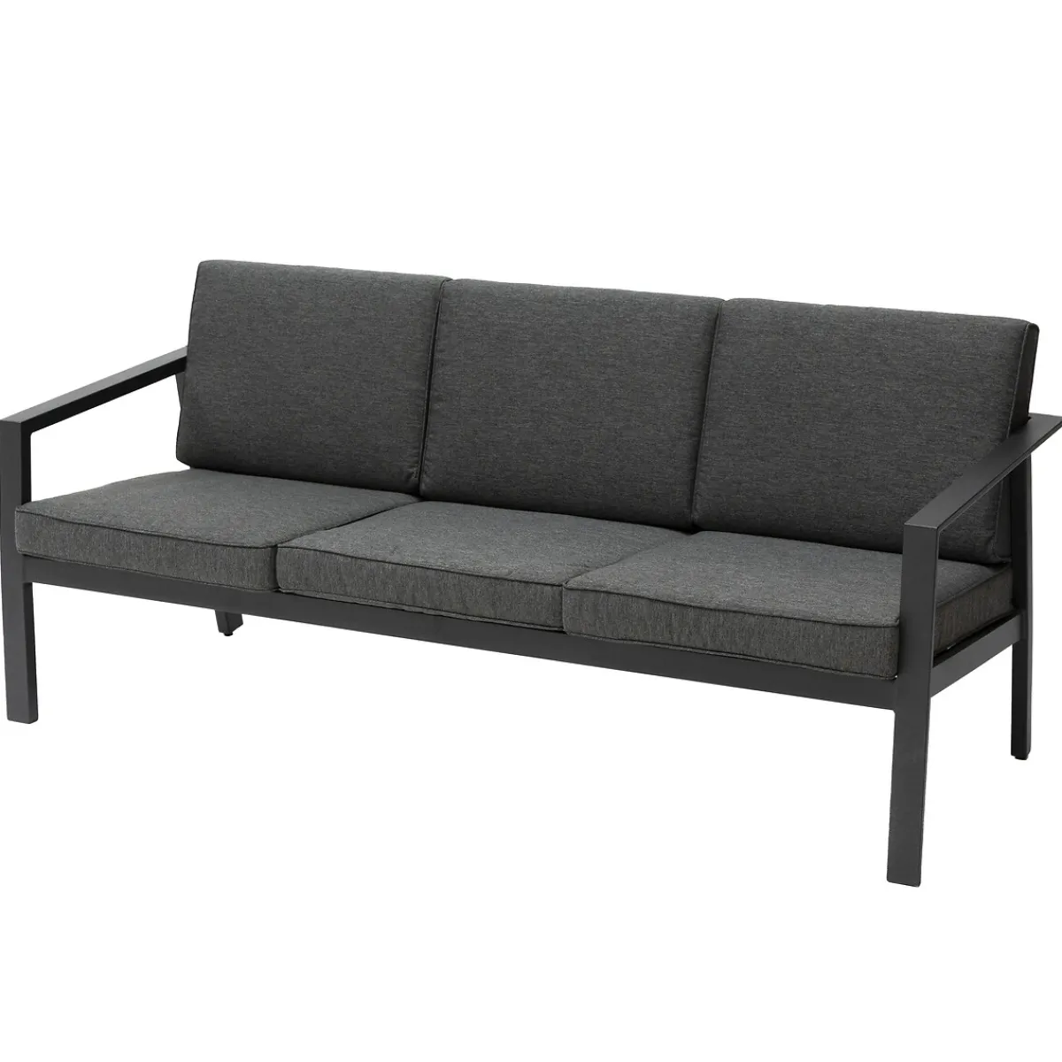 Juego de jardín PAVANE gris graphite | 5 Plazas | Compuesto por 2 sillones 69x73x63cm, 1 sofá de 3 plazas 185x73xx63cm, 1 mesa 120x60x39cm | Estructura antioxidante tratada con epoxi. Se puede quitar la funda de los cojines para facilitar la limpieza | Compatible con la referencia 412381 para proteger sus muebles del sol y de las inclemencias del tiempo. Producto tratado contra la decoloración | Peso máximo soportado por plaza: 110kg | Color: Grafito | Material: Aluminio, Poliéster | Marca: Hespéride