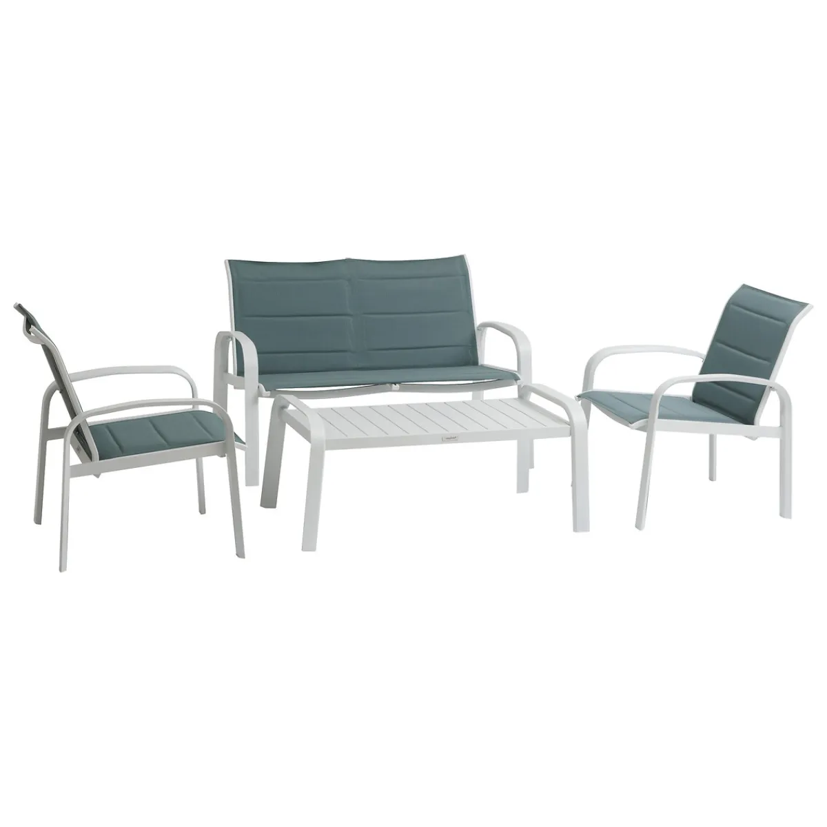 Juego ELYN verde claro y blanco de 4 plazas | Compuesto por 2 sillones, 1 sofá de 2 plazas y 1 mesa de centro | Medidas del sillón: 84x70x66cm; Medidas del sofá: 84x70x122cm; Medidas de la mesa: 46x60x104.7cm | Una creación acolchada para un confort óptimo. Espuma de secado rápido. Estructura tratada con epoxi. Producto tratado contra la decoloración, pies ajustables para compensar las irregularidades del suelo y proporcionar una mayor estabilidad. Peso máximo autorizado por persona: 110 Kg | Color del armazón: Blanco ; Color del asiento/respaldo: Verde jade | Material: Aluminio, Texaline | Marca: Hespéride