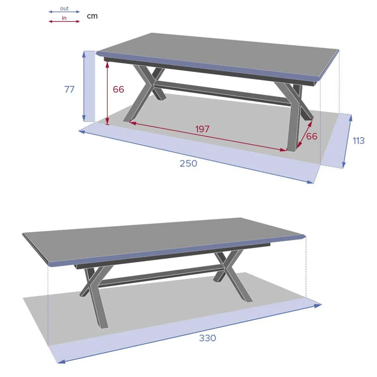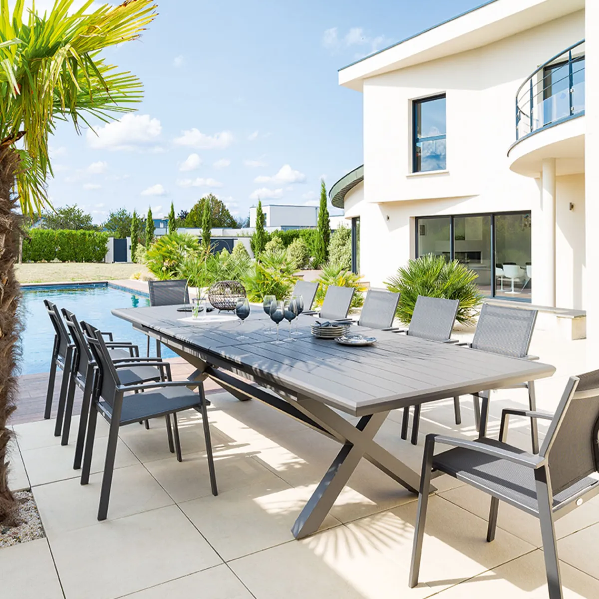 Mesa extensible AXIOME gris ardósia 250-330cm | Lamas Efecto Madera | Hasta 12 Sillas | La estructura de madera y aluminio de la mesa está pintada con epoxi, protegiéndola de los rayos UV y del óxido. Para mantener su mesa Axiome en las mejores condiciones durante mucho tiempo, considere cubrirla con una funda protectora adicional | Color: Gris Losa | Medidas: 77x113x250-330cm | Material: Aluminio | Marca: Hespéride