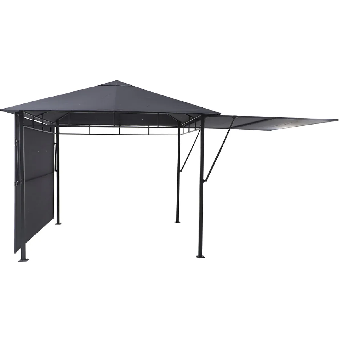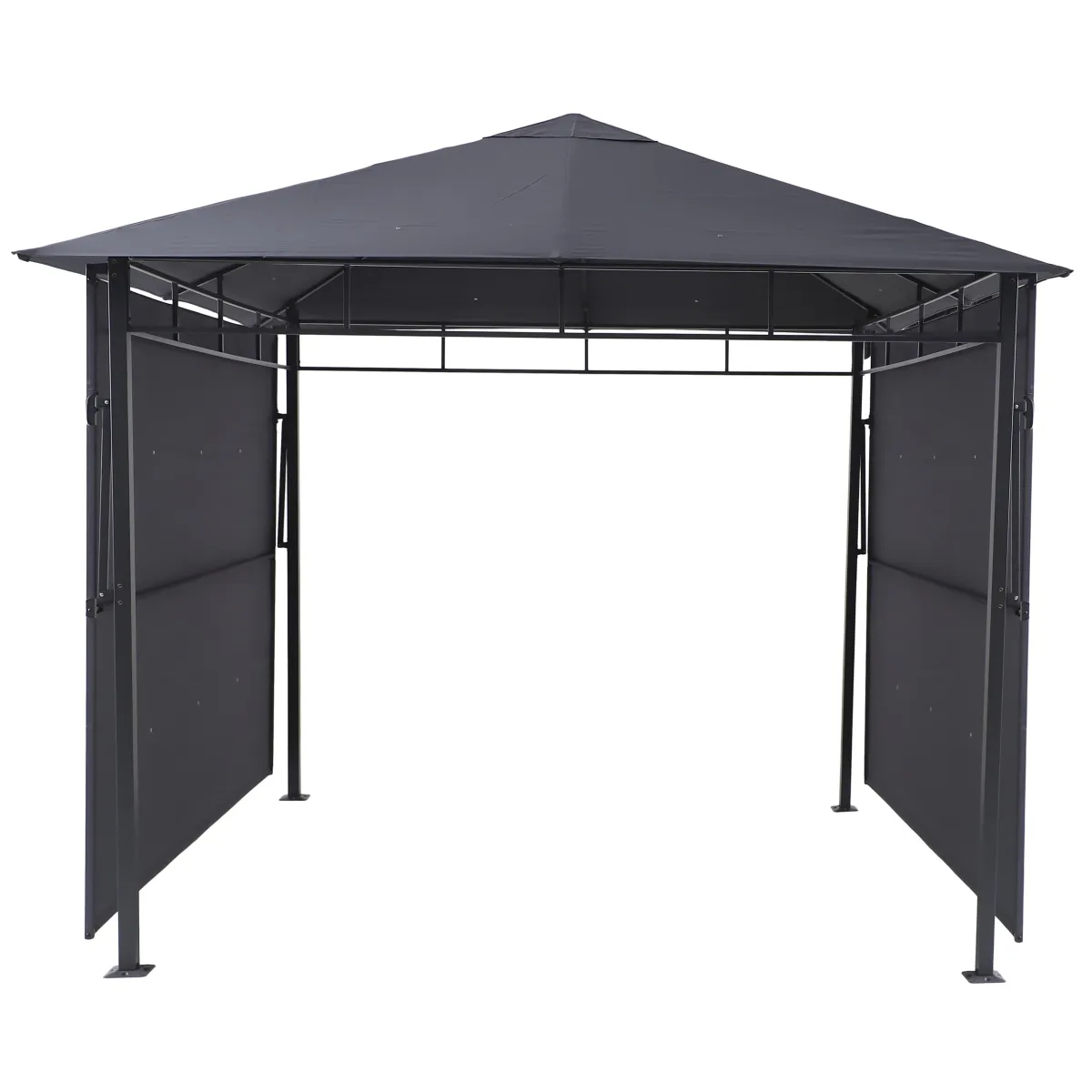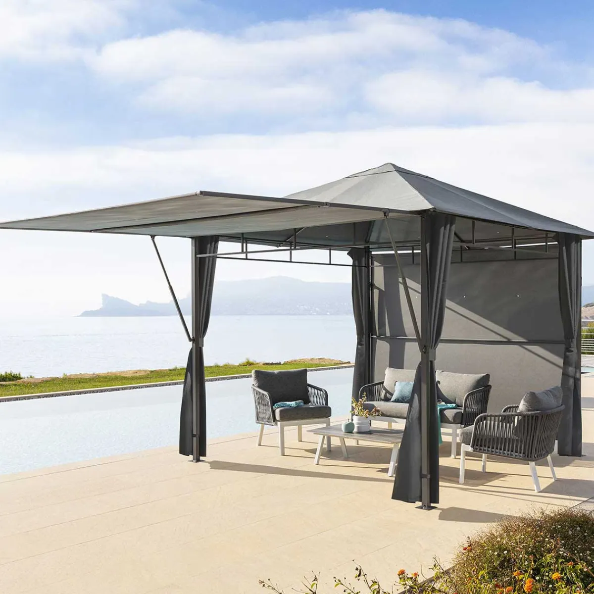 Pérgola OMELYA gris ardósia con cortinas 3x3m | El robusto armazón de acero tratado con epoxi resiste el óxido y la decoloración por rayos UV. El tejido impermeable impide que el agua de lluvia penetre en el material. | Color: gris ardósia | Medidas: 3x3m | Material: acero inoxidable, poliéster | Marca: Hespéride