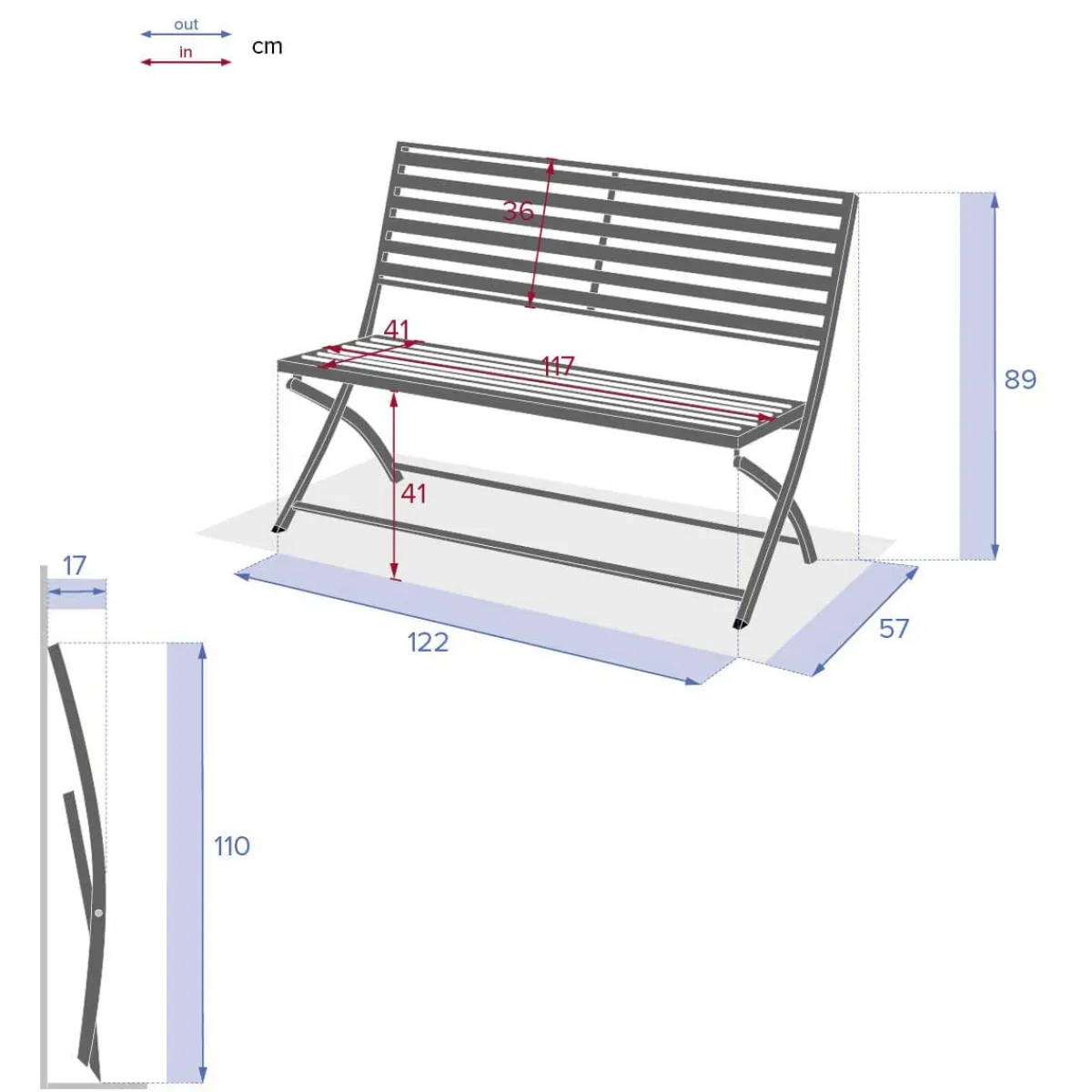 Banco plegable OLBIA gris graphite de metal | 3 Plazas | Disfruta de tu jardín con el bonito banco plegable Olbia Grafito de Hespéride. Este banco de exterior ofrece 3 plazas, tiene una estructura de acero con tratamiento epoxi y es fácil de montar. | Medidas: 122x57x89cm