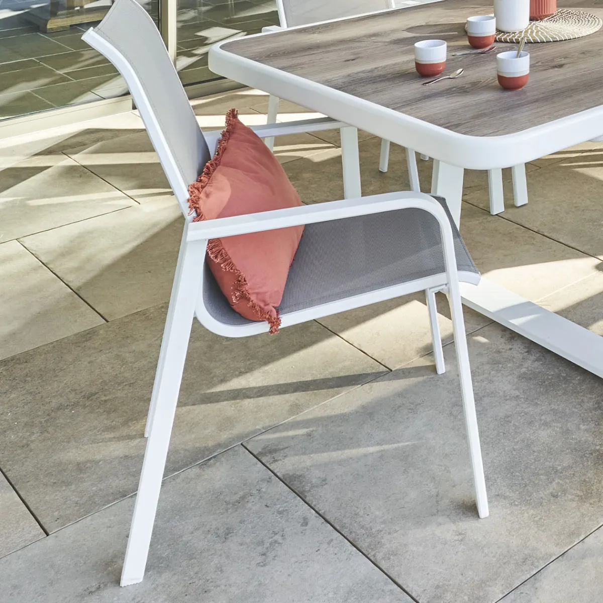 Silla Essio Blanco Y Avellana | 100×57.5x68cm | La silla «Essentia» tiene un aspecto moderno y refinado. La mezcla de materiales caracteriza su estética y la convertirá en una pieza decorativa por derecho propio. El aluminio tratado con texalina y epoxi tiene muy buena resistencia a la lluvia ligera y al óxido. Procura cubrir la silla con una lona y guardarla cuando haga mal tiempo. En cuanto al mantenimiento, basta con agua, jabón y un paño seco. | Color: avellana, blanco | Tamaño: 100×57.5x68cm | Material: textileno, aluminio | Marca: Hespéride