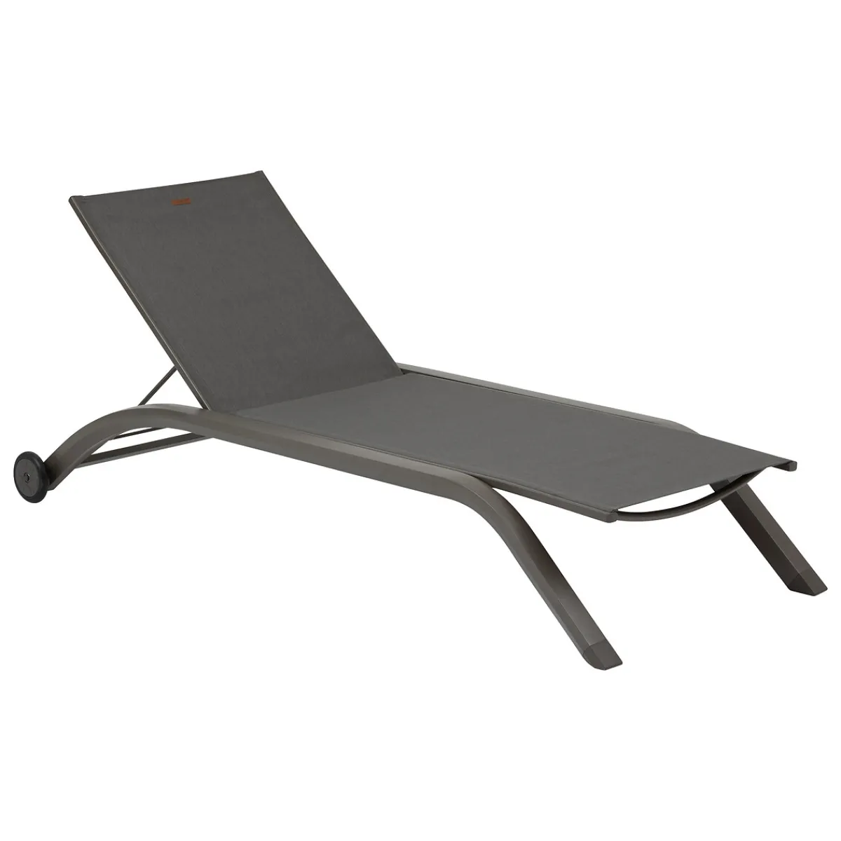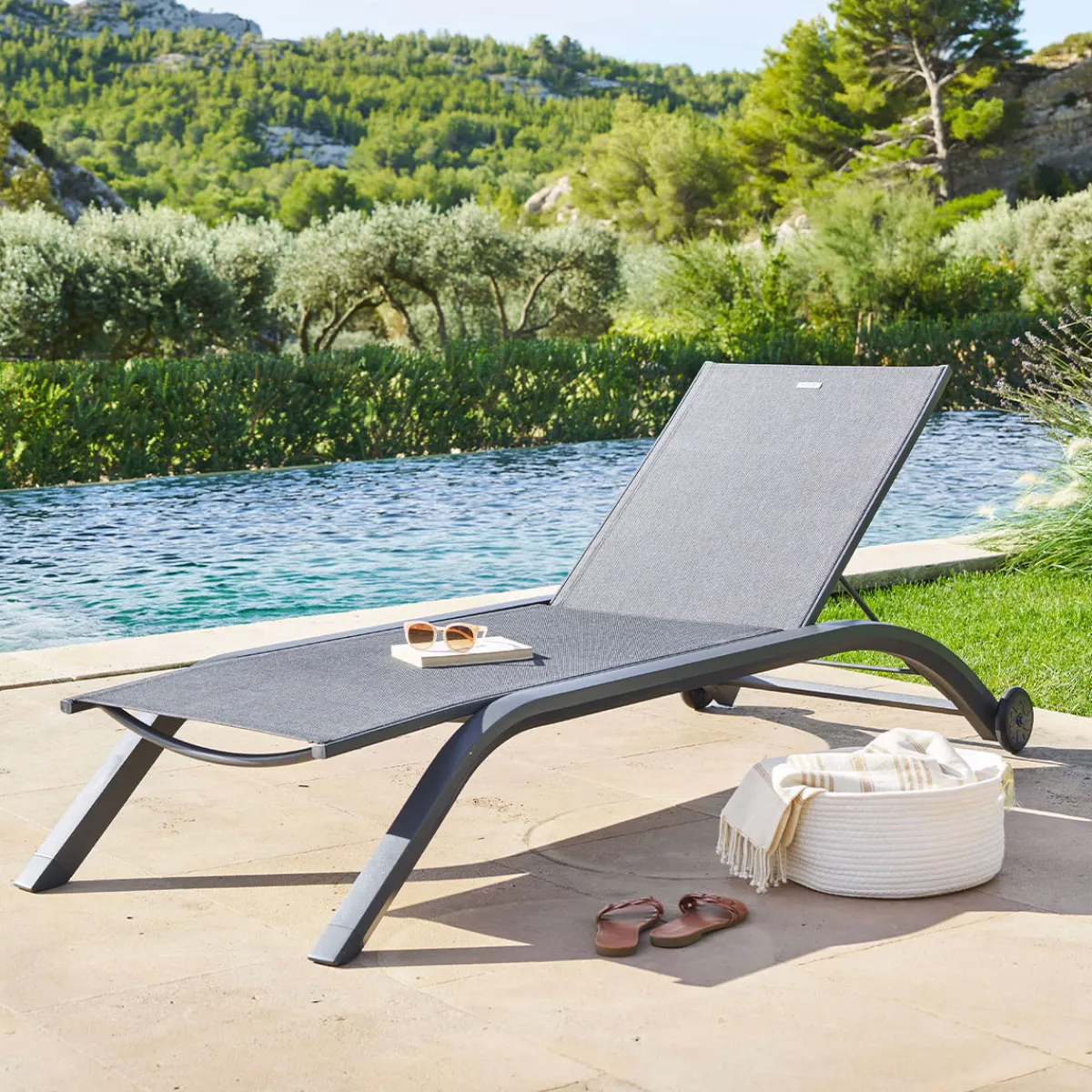 Tumbona JIMANI gris antracite y graphite | Cojín no incluido | 99x86x196cm | Elemento indispensable en su jardín, la tumbona Jimani se adapta perfectamente a su entorno | Reclinable en 4 posiciones, permite tumbarse completamente para un máximo confort. Con 2 ruedas, es fácilmente transportable | Producto apilable, fácil de guardar para un verdadero ahorro de espacio | Peso máximo autorizado por persona: 110 Kg | Color: Antracita, Grafito | Tamaño: 99x86x196cm | Material: Aluminio, Textilene | Marca: Hespéride