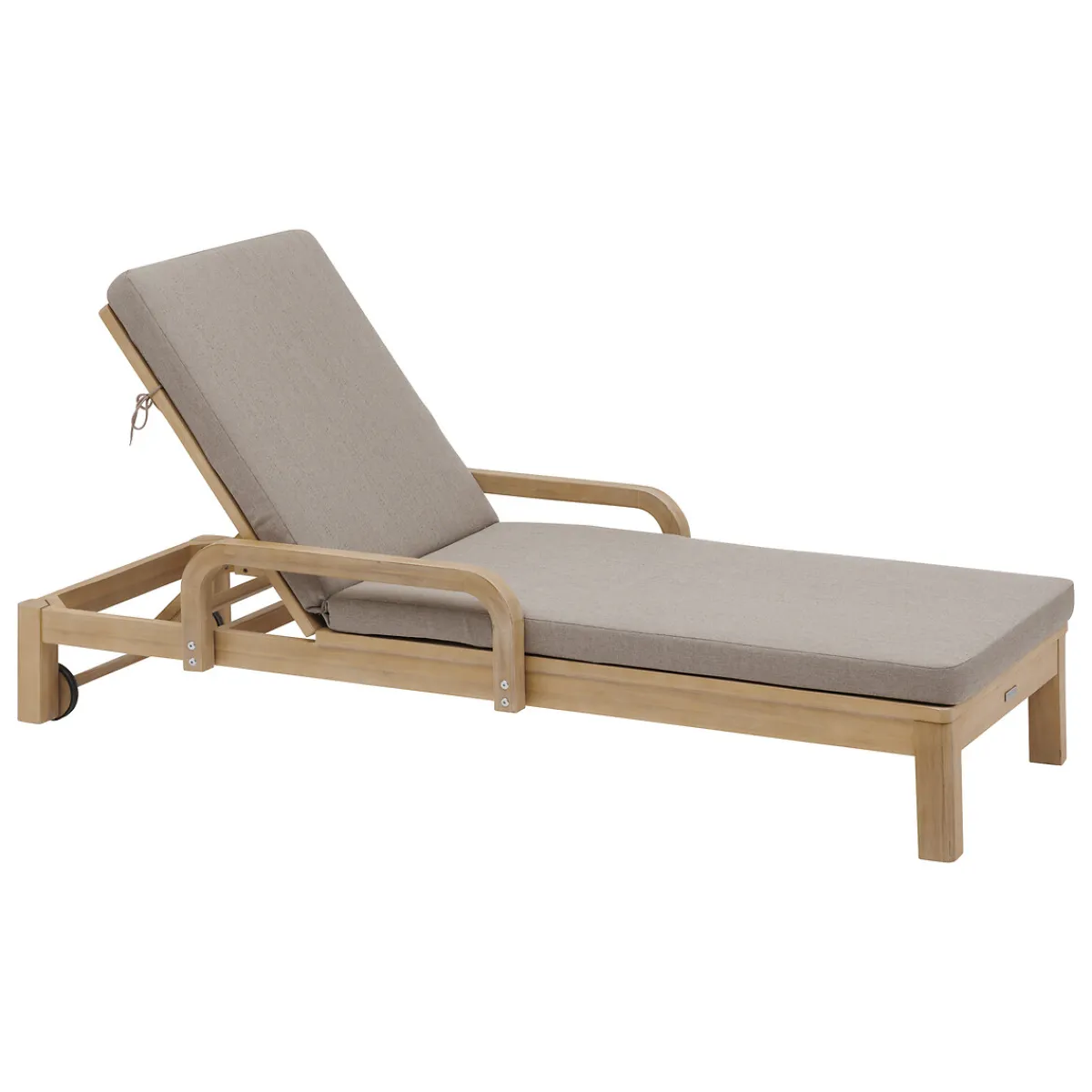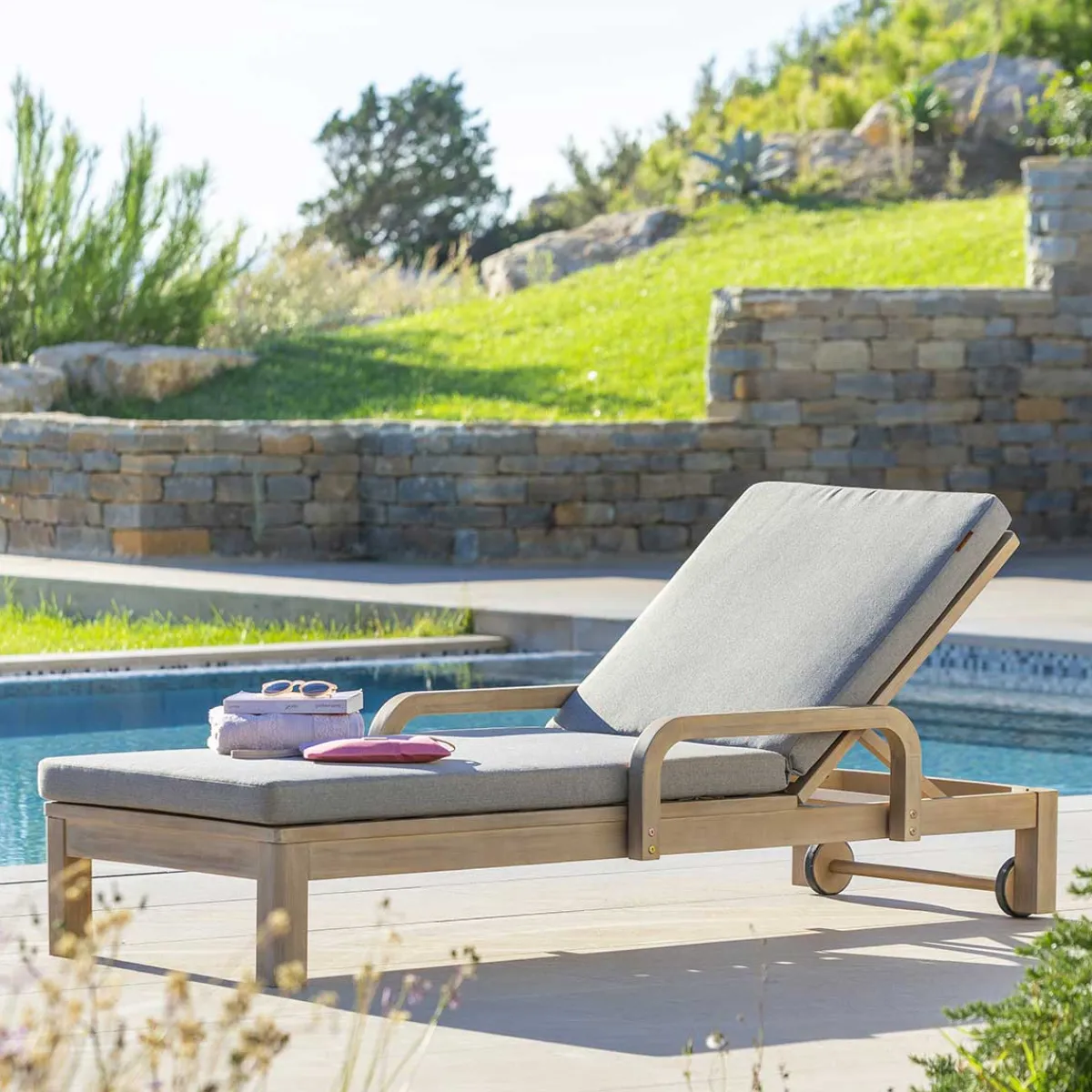 Tumbona PAPOUASIE gris pardo de madera acacia | Cojín: Gris Pardo | 184x73x87cm | Madera Fsc, protegida con barniz. Se puede quitar la funda de los cojines para facilitar la limpieza. Compatible con la referencia 412392 para proteger sus muebles del sol y de la intemperie. Hasta 5 posiciones de reclinado. Posición 100% tumbada para un confort óptimo. Tejido con tratamiento hidrófugo que permite que el agua resbale sin penetrar en el material | Peso máximo soportado: 110Kg | Marca: Hespéride