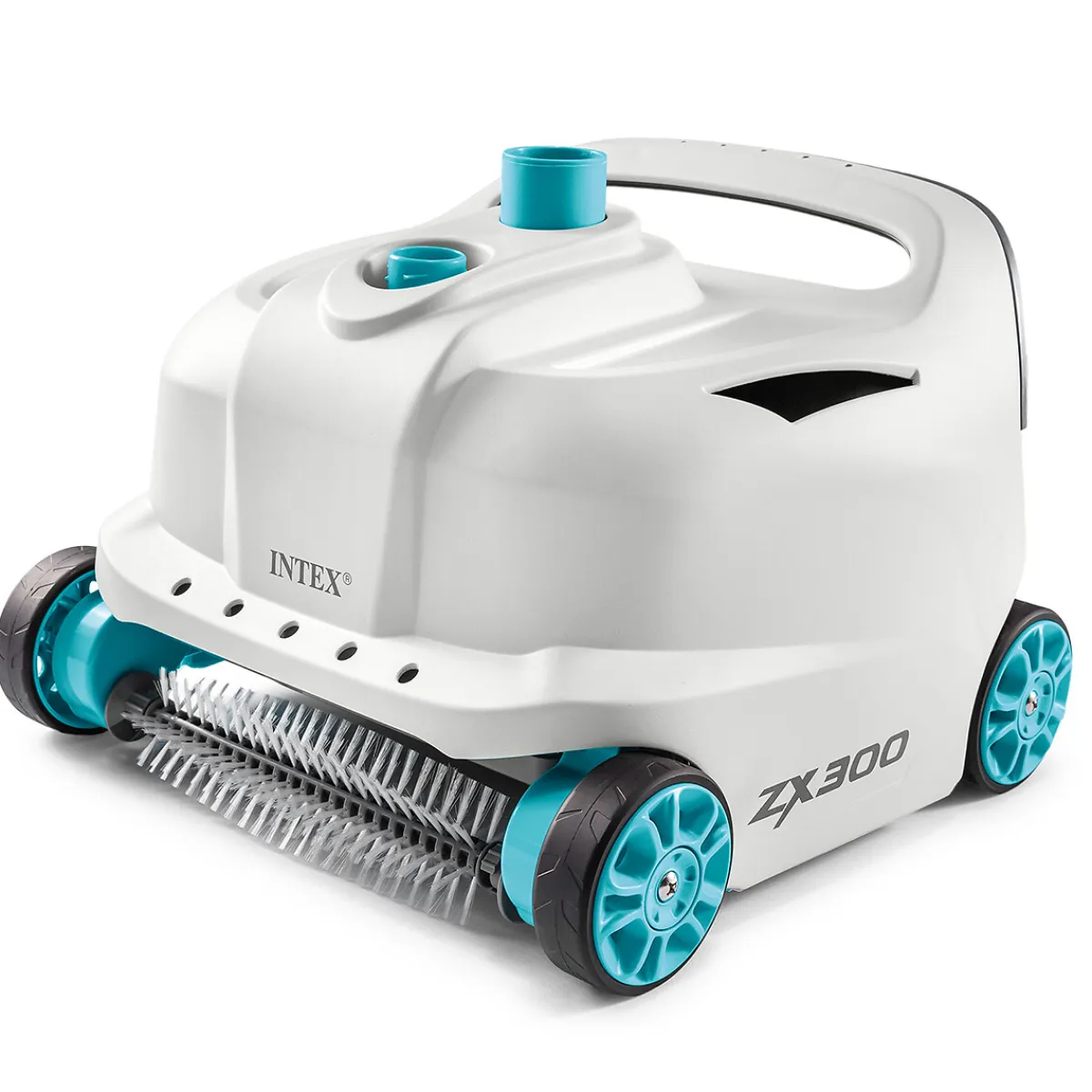Limpiafondos Intex Para Piscinas | El robot de presión hidráulica intex limpia suelos y paredes en piscinas de hasta 6 metros | Funciona con depuradora: requiere una depuradora con un caudal de entre 6.056 y 13.248 litros/hora para funcionar correctamente | Instalación: conectar desde el interior de la piscina, a la entrada de agua y desenroscar la boquilla | Utilización: el robot se desplaza con una presión de agua de 2.649L/h sobre el suelo y las paredes, levantando la suciedad para su posterior filtración por la depuradora | Extras: incluye manguera antienredos de 6.5 metros y depósito con cesta extraíble