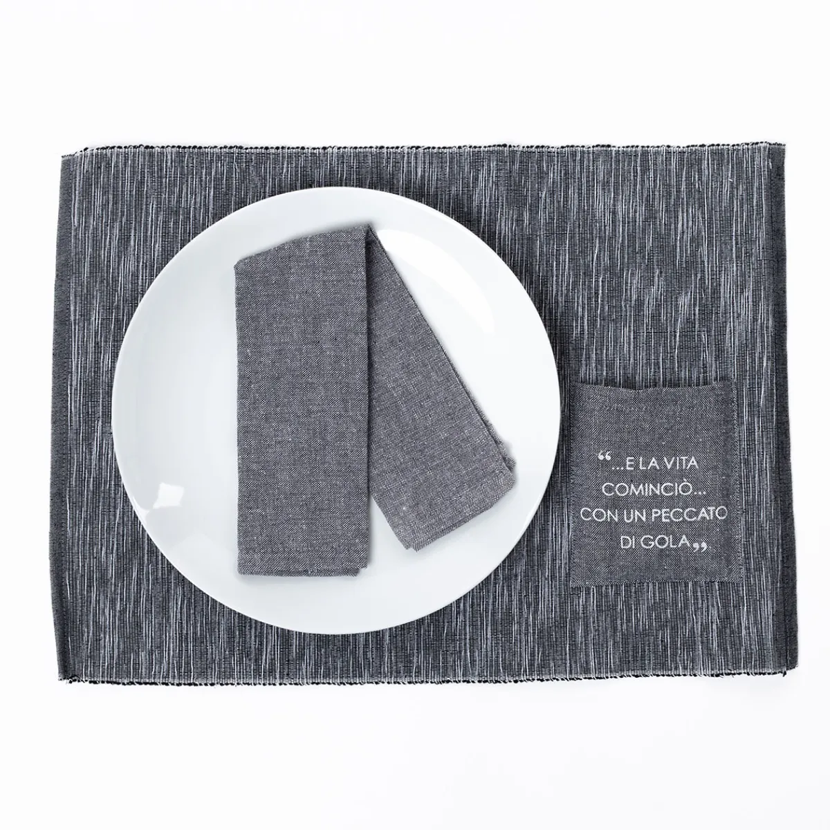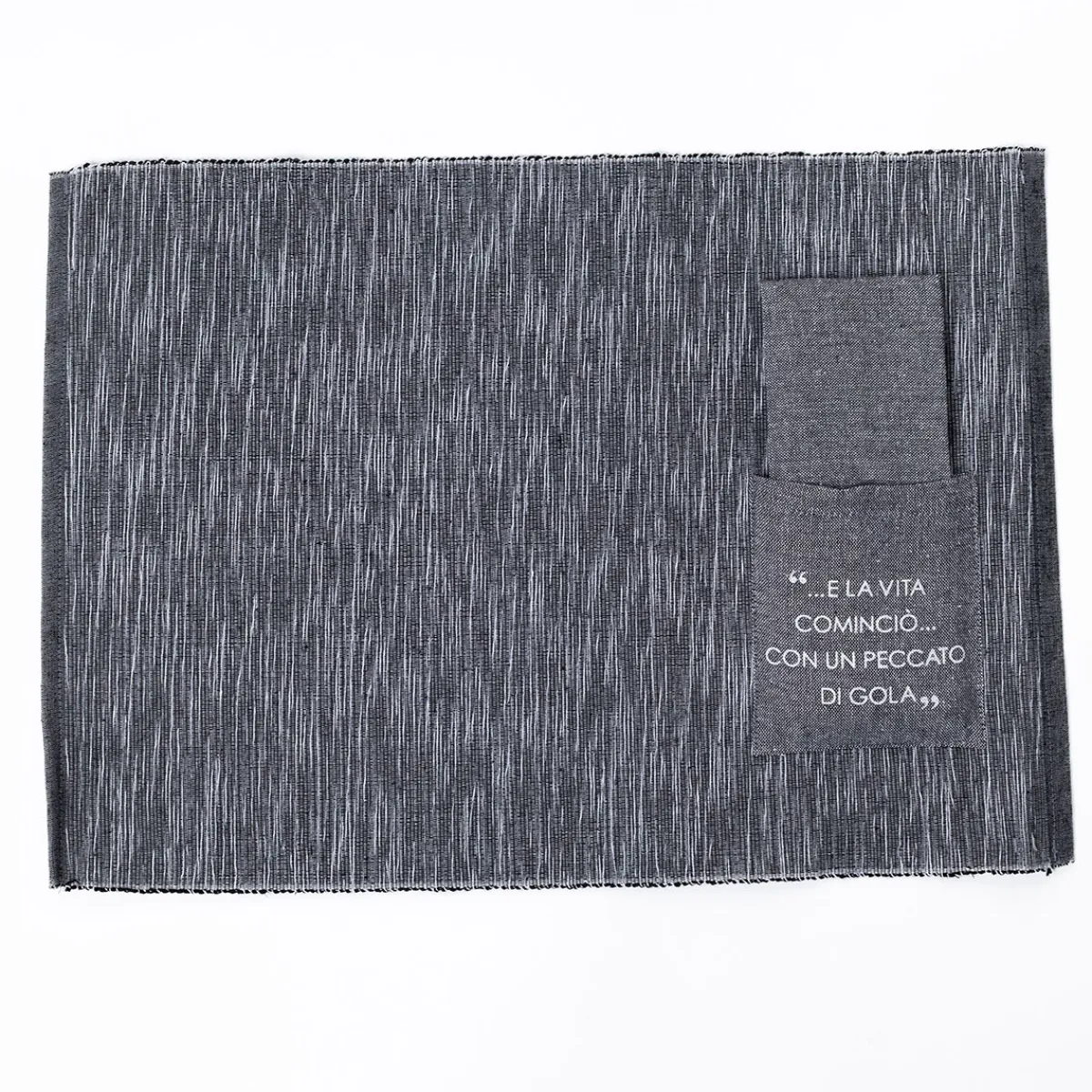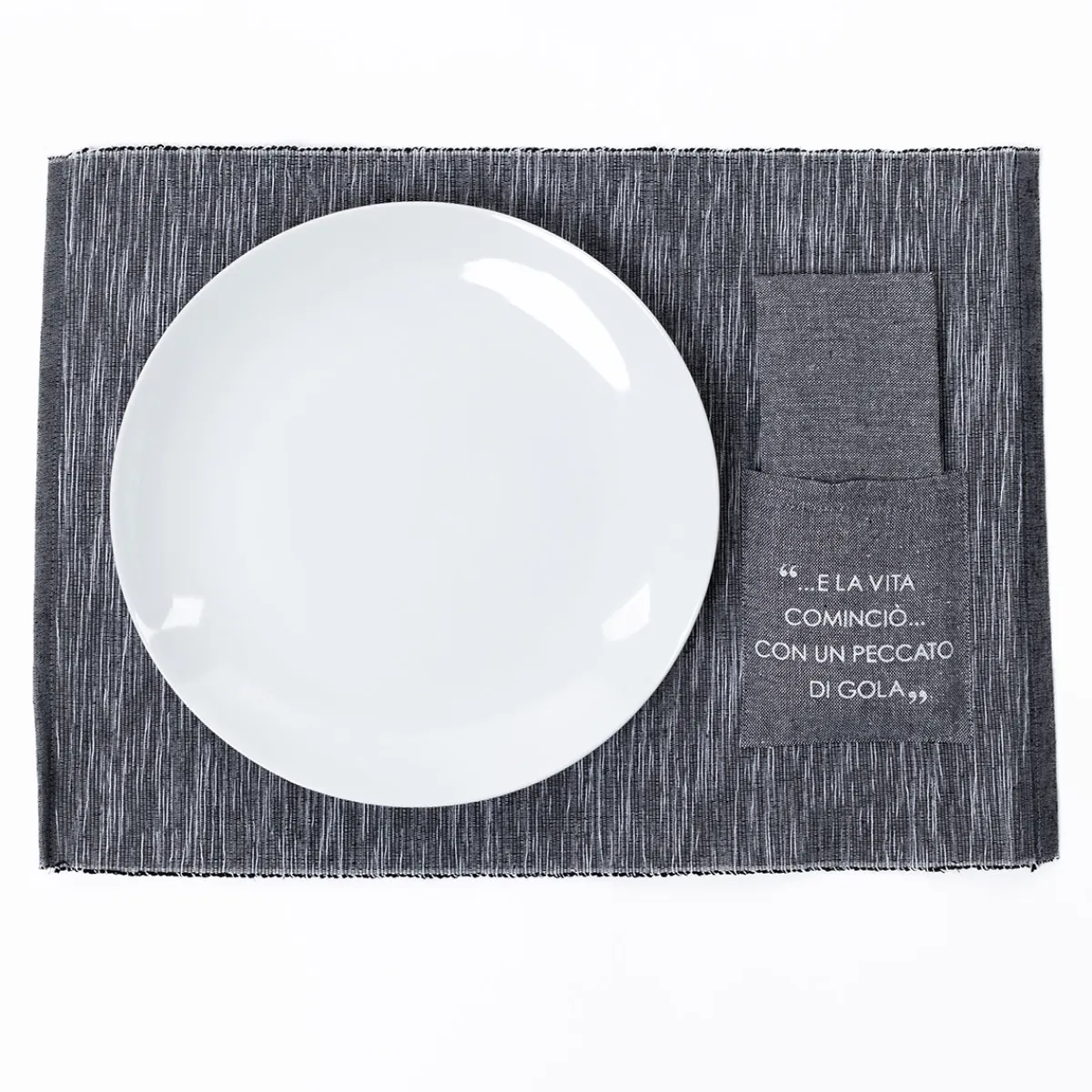 Juego individual con bolsa cubiertos y servilleta | Viste tu mesa y cocina con nuestra colección de textiles de cocina. Manteles, servilletas para servir sin olvidar la funcionalidad de los delantales y paños de cocina. ¡Cada detalle es fundamental! | Color: Gris oscuro | Medidas: 16x33cm | Material: Algodón, Poliéster
