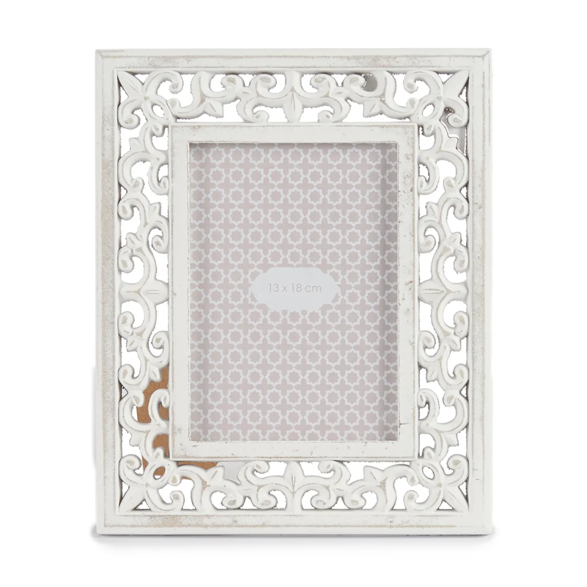 Portarretrato tallado blanco de madera 13x18cm | Descubre este y otros portarretratos y marcos de fotos que tenemos para ti. Recuerda los mejores momentos con los marcos hôma y decora tu casa a juego con tu felicidad. | Color: Blanco | Medidas: 13x18cm | Material: Madera