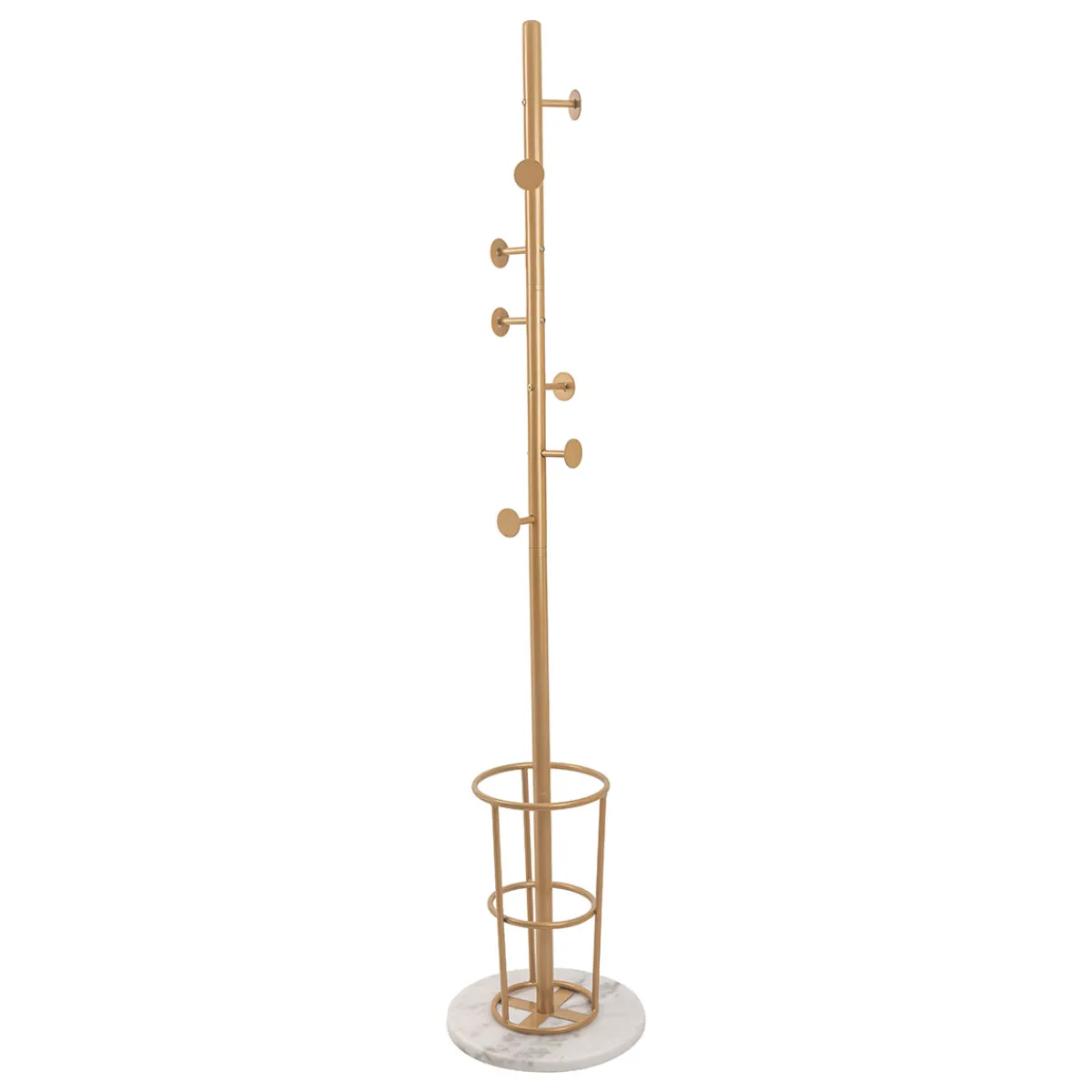 Perchero con 7 ganchos de metal dorado | 176x37x37cm | Peso máximo para cada gancho: 4 kilos/ Peso máximo para el paragüero: 5 kilos | Descubre este y más artículos que tenemos disponibles para tu armario. Ordenar y organizar sus armarios y roperos ¡nunca ha sido tan fácil! Descubra la gama de almacenaje hôma | Color: Dorado| Medidas: 176x37x37cm | Material: Metal