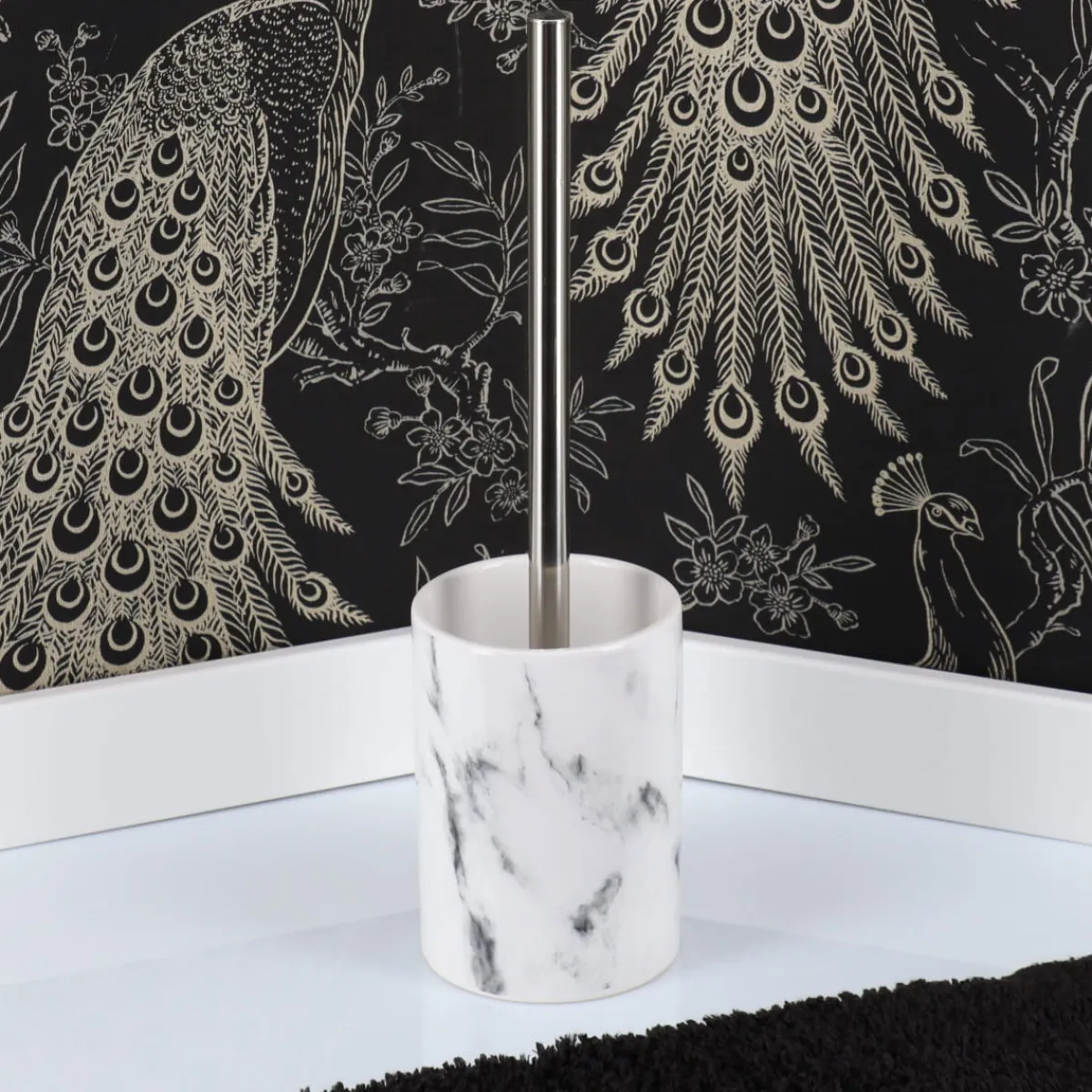 Escobilla De Baño Con Soporte Efecto Mármol | Los accesorios y la organización del baño son esenciales para que tus rutinas más personales te traigan todo el bienestar que te mereces. ¡Conoce nuestra colección de accesorios para el baño! | Color: Blanco | Medidas: 35×9.5×9.5cm | Material: Metal | Color: Blanco