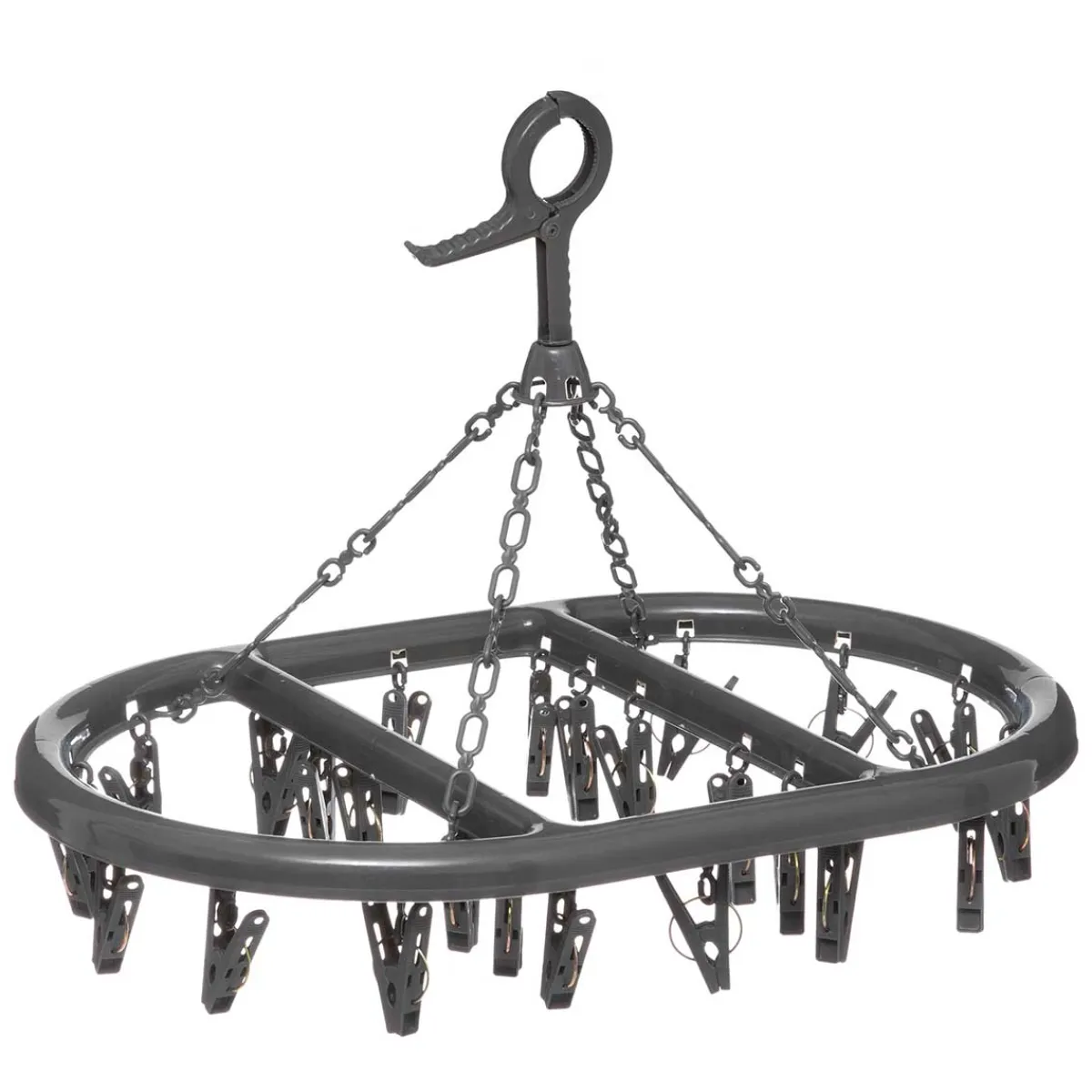 Tendedero Ovalado Con 24 Pinzas | Descubre este y más artículos de la gama de almacenaje hôma. Nuestros artículos de almacenaje para el lavadero y para el trastero harán que disfrutes al máximo de tus espacios | Medidas: 28x36x49cm | Material: Polipropileno | Color: Gris oscuro