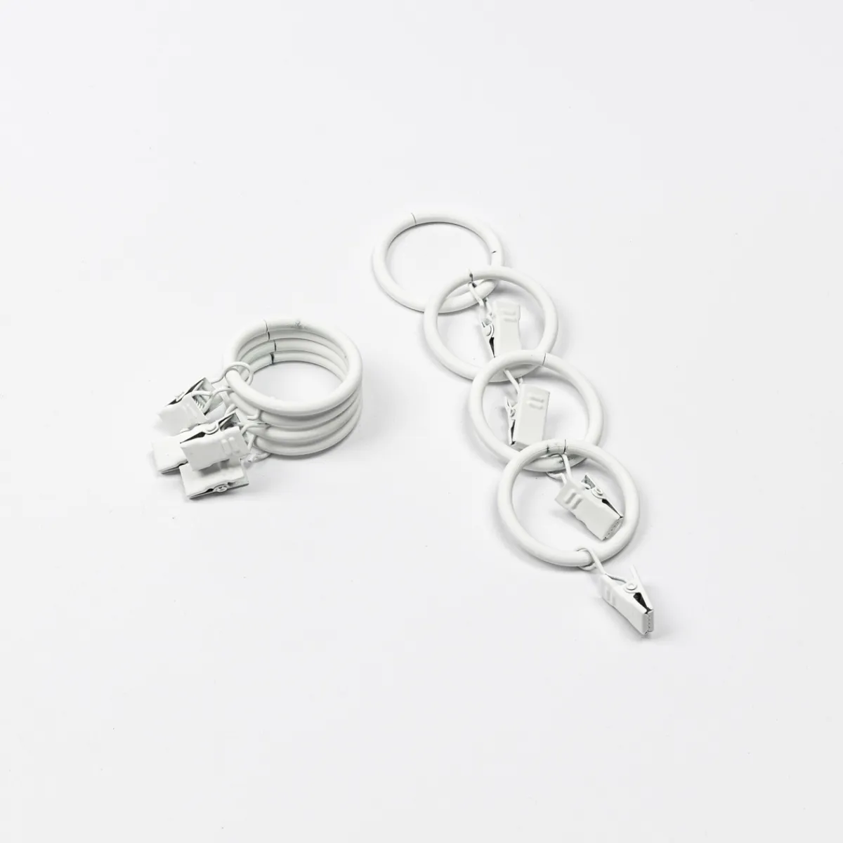 Juego De 8 Anillas Con Pinzas Blanco Mate D20cm | Adorna tus ventanas y garantiza tu intimidad al máximo. Encuentra todos los accesorios para colgar tus cortinas y completar la decoración con el estilo que más te gusta. Contamos con diferentes opciones de soportes, barras de cortina, barras de extensión, rieles que se ajustan a la longitud, al contorno y a las esquinas de cada ventana. También disponemos de una selección de ganchos, anillas, remates todo esto en diferentes colores y materiales | Color: Blanco mate | Medidas: 20cm