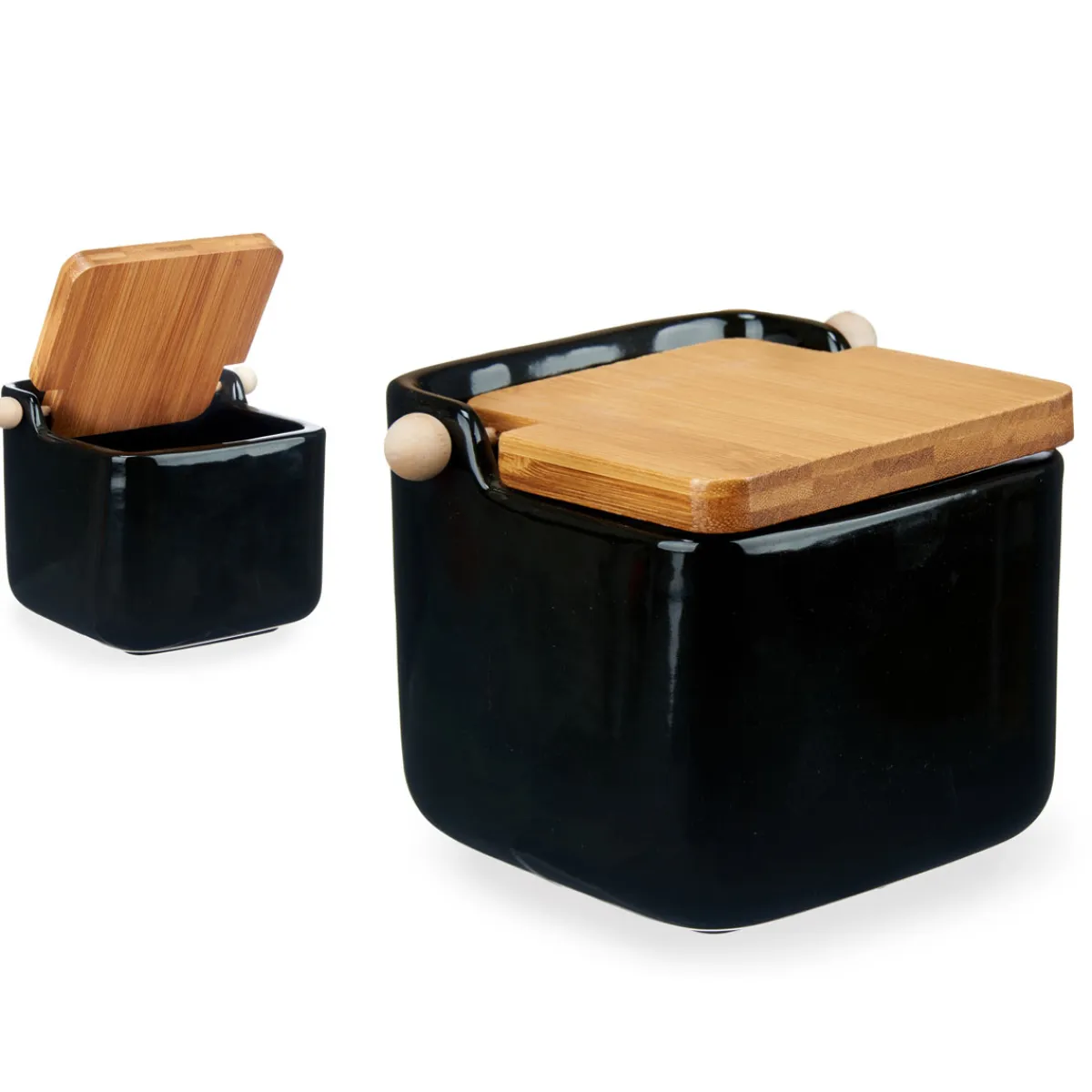 Salero Negro De Cerámica +Tapa Bambú 1800Ml | Todo lo que tu mesa necesita está en homa.es, echa un vistazo a nuestra colección de vajillas, vasos, cubiertos, posavasos, soportes, etc. ¡Sirve con Happy Home Living, y todo sabrá mucho mejor! | Color: Negro, Beige | Medidas: 11x11x12cm | Material: Cerámica, Bambú | Capacidad: 1800ml